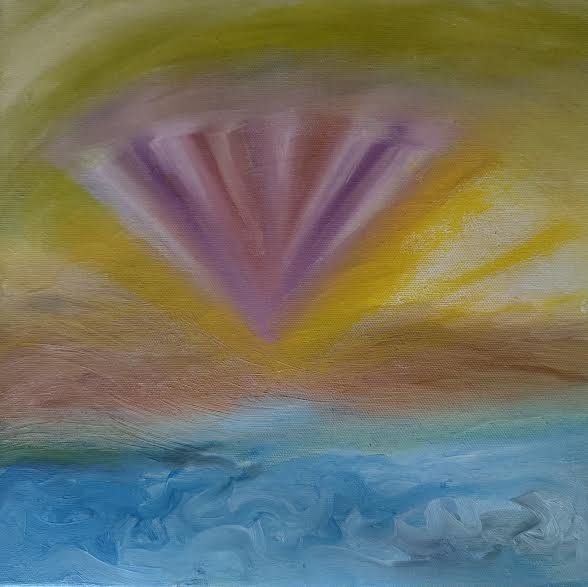 Suspended above animated waters, the hand of God releases rays of purple, red, and white–sacred frequencies in motion. What begins as light becomes form: a crystalline diamond, floating in a golden sky.