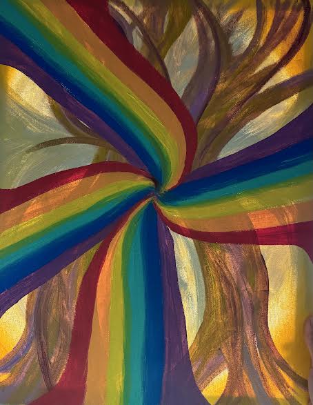 The trees, typically behind him in the traditional scene, are painted in front–reminding us that nature always stood witness, not behind, but before. And before them all, a rainbow vortex spins: the original Source where the story of Christ fragmented into infinite refracted truths.